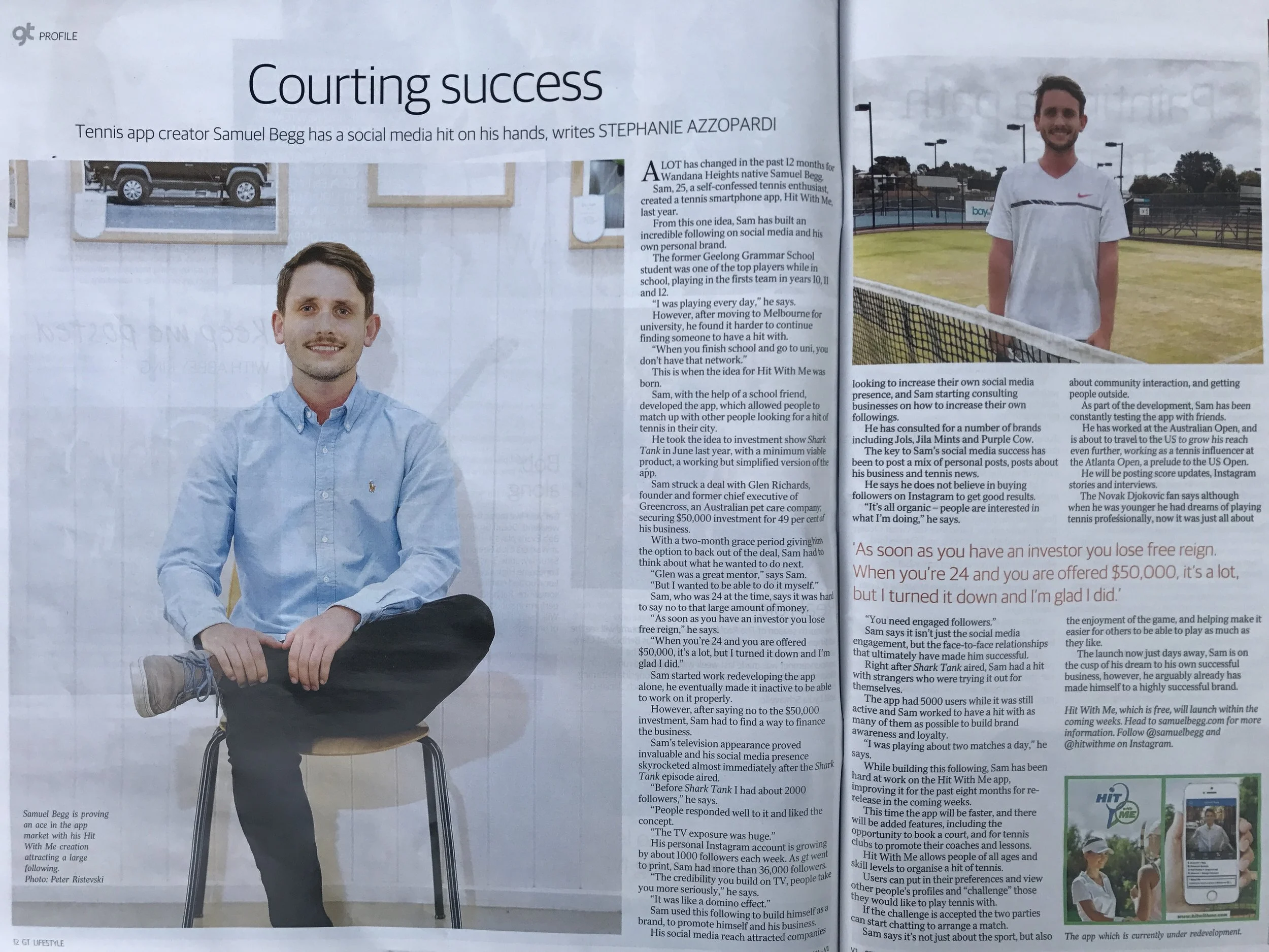 @SamuelBegg pitched his startup Hit With Me on Shark Tank Australia on June 22, 2016. The tennis app received a deal from Dr. Glen Richards. The app was trending on the app store soon after the TV episode went to air on TEN.